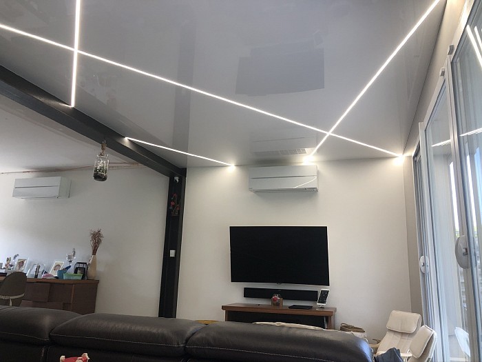 Plafond tendu blanc laqué avec bande led intégré pour un effet design original et moderne